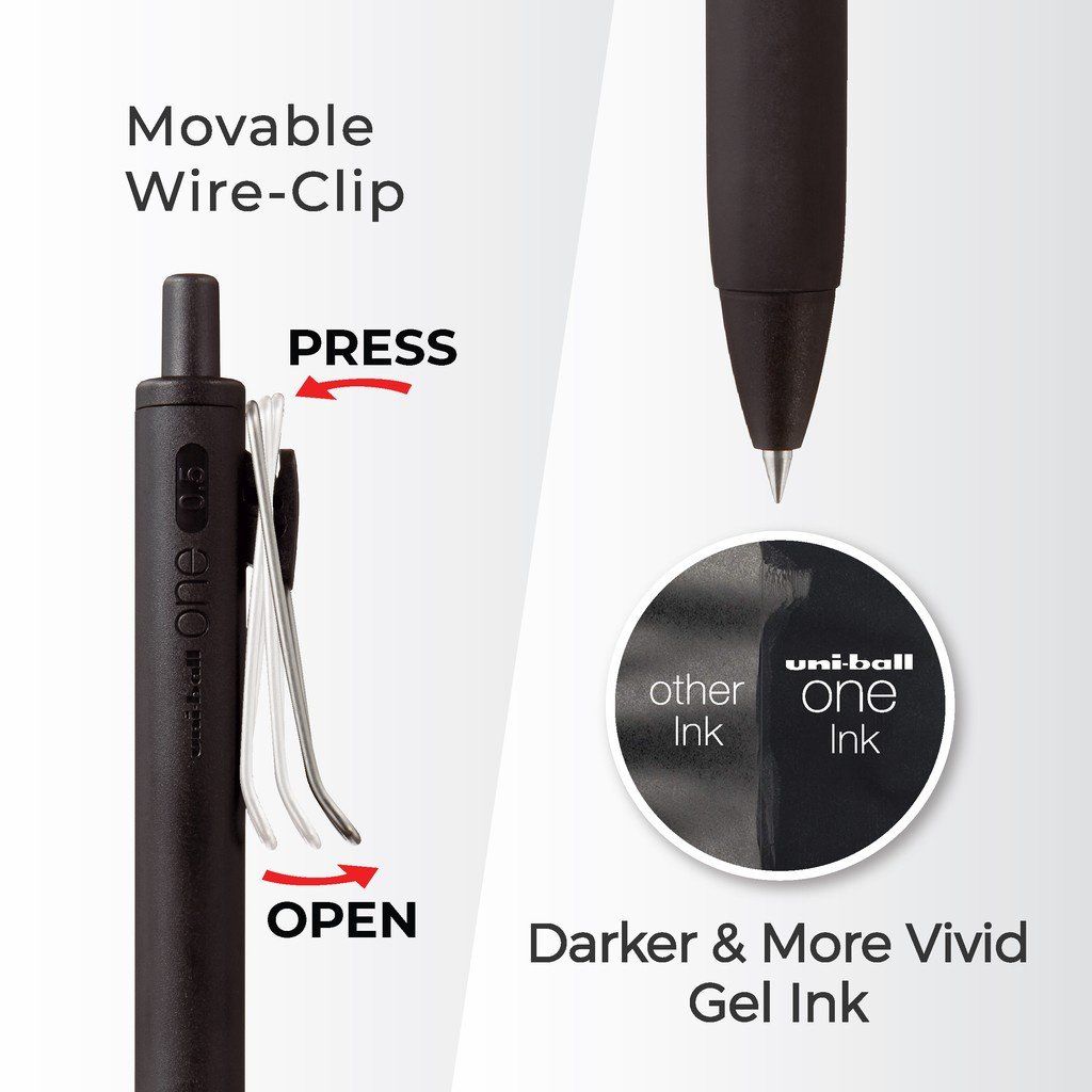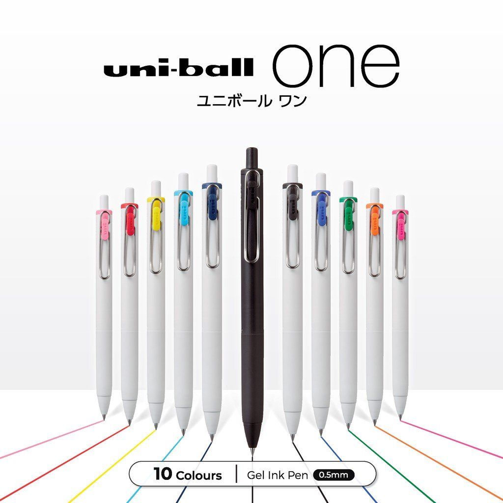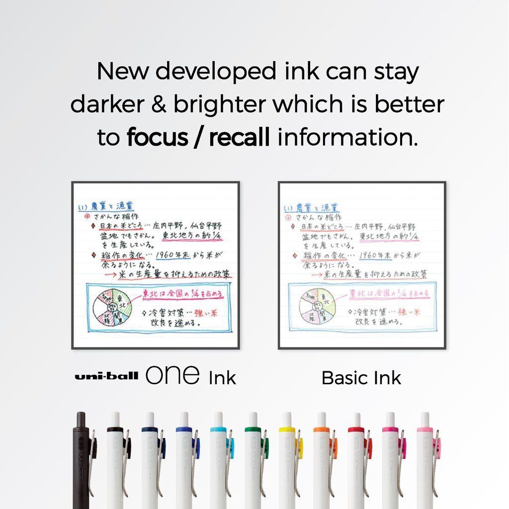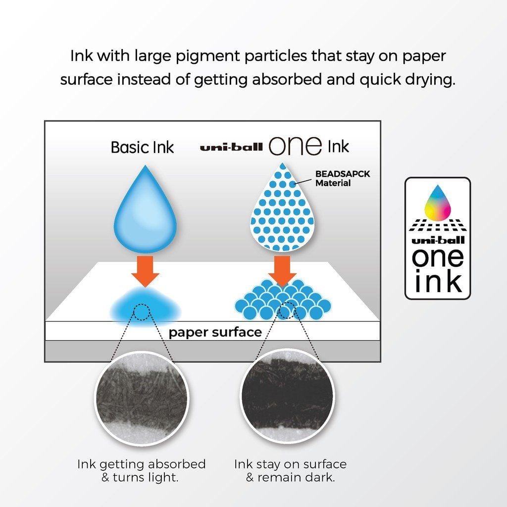 Mực "uni-ball one" mới được phát triển sử dụng một sắc tố mới, không giống như các loại mực gel thông thường, giảm thiểu sự xâm nhập của vật liệu tạo màu vào sợi giấy đồng thời ngăn chặn vật liệu màu bị hấp thụ vào bề mặt giấy và không bị lem hoặc nhòe do công nghệ khô nhanh của nó.