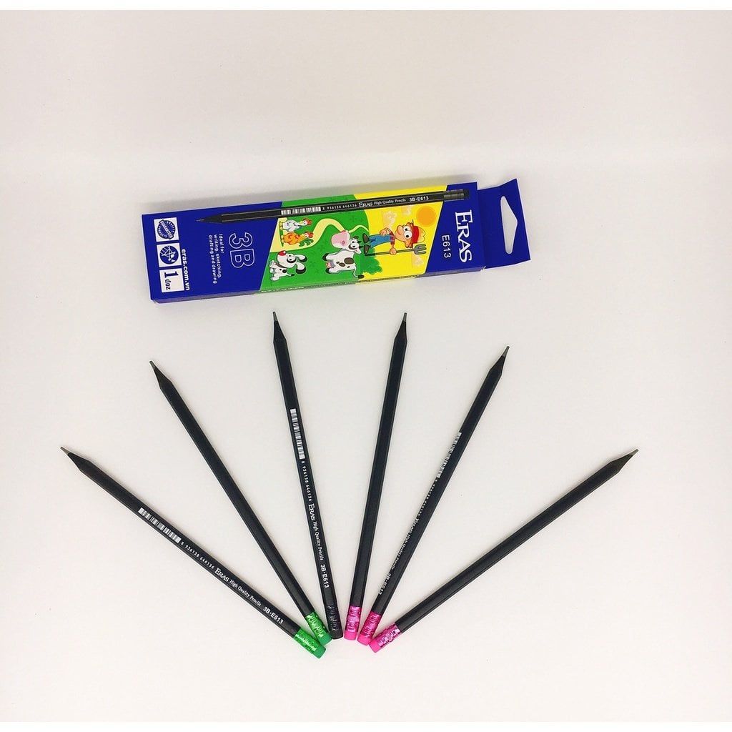 [ERAS] Bút chì 3B Eras E613 sản phẩm chính hãng MÔ TẢ SẢN PHẨM: - Thương hiệu: ERAS - Mã sản phẩm: E613ERAS - Sản phẩm các loại bút chì gỗ sơn đen 2B, 3B, 4B, 5B, 6B chất lượng cao. - Được sản xuất theo công nghệ của Đức. - Xuất xứ: Việt Nam. - Kích thước: dài 19 cm. - Màu sắc: đen. - Chì gỗ với đường nét nhỏ và mềm phù hợp với học sinh, sinh viên, thiết kế. -----------------------------------------------------------------