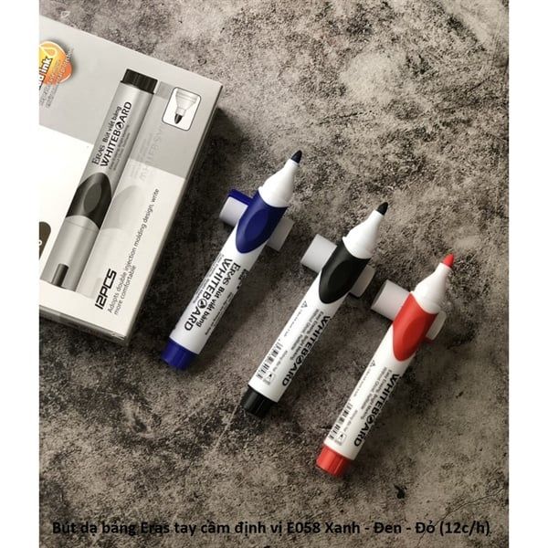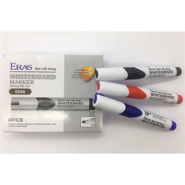 [ERAS] Bút dạ bảng Eras E058 sản phẩm chính hãng MÔ TẢ SẢN PHẨM: - Thương hiệu: ERAS - Mã sản phẩm: E058XERAS - Bút dạ có Tay cầm định vị bằng cao su, mềm mại, êm ái. - Có gờ chống lăn, giúp bút không chạy lung tung khi để trên bề mặt dốc. - Mực đậm sử dụng dễ dàng và dễ xoá. - Không độc hại thân thiện với môi trường Phù hợp với mọi độ tuổi. - Nhỏ gọn Dễ dàng mang theo sử dụng - Màu sắc ;Đen, Đỏ, Xanh. ----------------------------------------------------------------- * Quý khách vui lòng liên hệ shop để được tư vấn * Hotline - zalo: 0355238747 #Văn_phòng_phẩm #M&G #Baoke