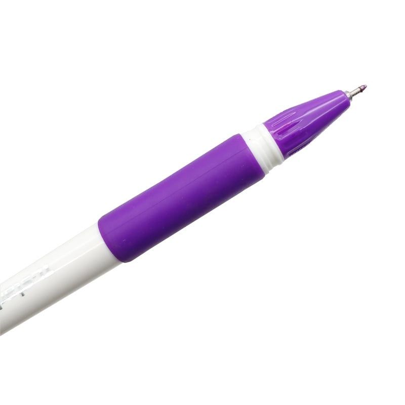 Thân và nắp bút bằng nhựa trắng đục, in nhũ kim loại.