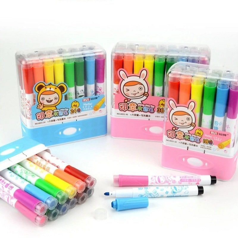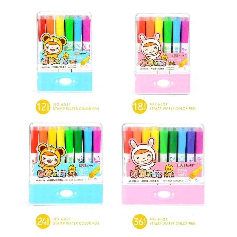 - Bút dạ màu marker kèm dập dấu RUI 6021. - 12/18/24/36 màu với nắp bút phía trên được thiết kế có tích hợp dập dấu với nhiều hình vô cùng đáng yêu.