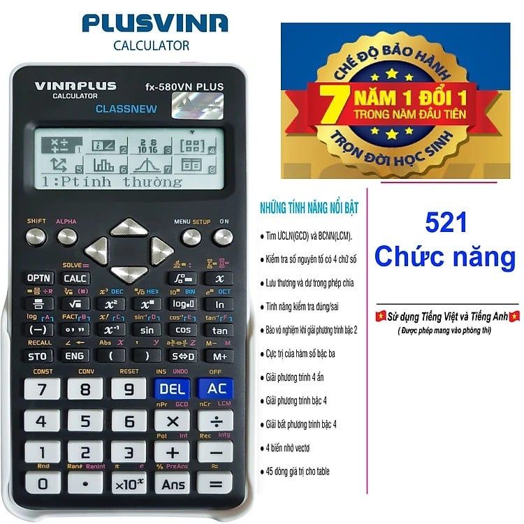 Máy tính fx-580VN PLUS sử dụng tiếng Việt và tiếng Anh thuộc dòng máy tính khoa học Máy được trang bị màn hình LCD có độ phân giải cao. Độ phân giải của màn hình của FX 580VN PLUS được tăng gấp 4 lần, hỗ trợ tăng lượng thông tin hiển thị cũng như cải thiện tính tiện dụng của sản phẩm. Đây là chiếc máy tính khoa học có hiệu suất cao, tốc độ tính toán nhanh; phù hợp với nhiều cấp học từ học sinh, sinh viên.