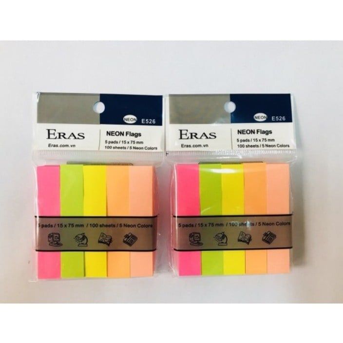 [ERAS] Giấy nhớ 5 màu Eras E526 sản phẩm chính hãng MÔ TẢ SẢN PHẨM: - Thương hiệu: ERAS - Mã sản phẩm: E526ERAS - Giấy Note Eras 5 Màu. - E526 là loại giấy viết lên được, mặt sau có lớp có keo nhẹ có thể dễ dàng dán lên và lấy đi trên mọi mặt phẳng: màn hình và vỏ máy tính, bàn làm việc, cặp tài liệu dễ dàng bóc ra mà không để lại vết keo bẩn trên đó. - Giấy bắt mực tốt, cho mực nhanh khô, không lem nhòe, không làm mực bị in hằn sang mặt sau. - Người dùng có thể dễ dàng mang theo sản phẩm bên mình, sử dụng mọi lúc mọi nơi, vô cùng tiện lợi. - Giấy màu trơn, không hoa văn, có nhiều Màu sắc thanh nhã, tươi sáng cho bạn lựa chọn. - Sản phẩm phù hợp với nhiều mục đích sử dụng khác nhau trong công việc và học tập. ----------------------------------------------------------------- * Quý khách vui lòng liên hệ shop để được tư vấn * Hotline - zalo: 0355238747